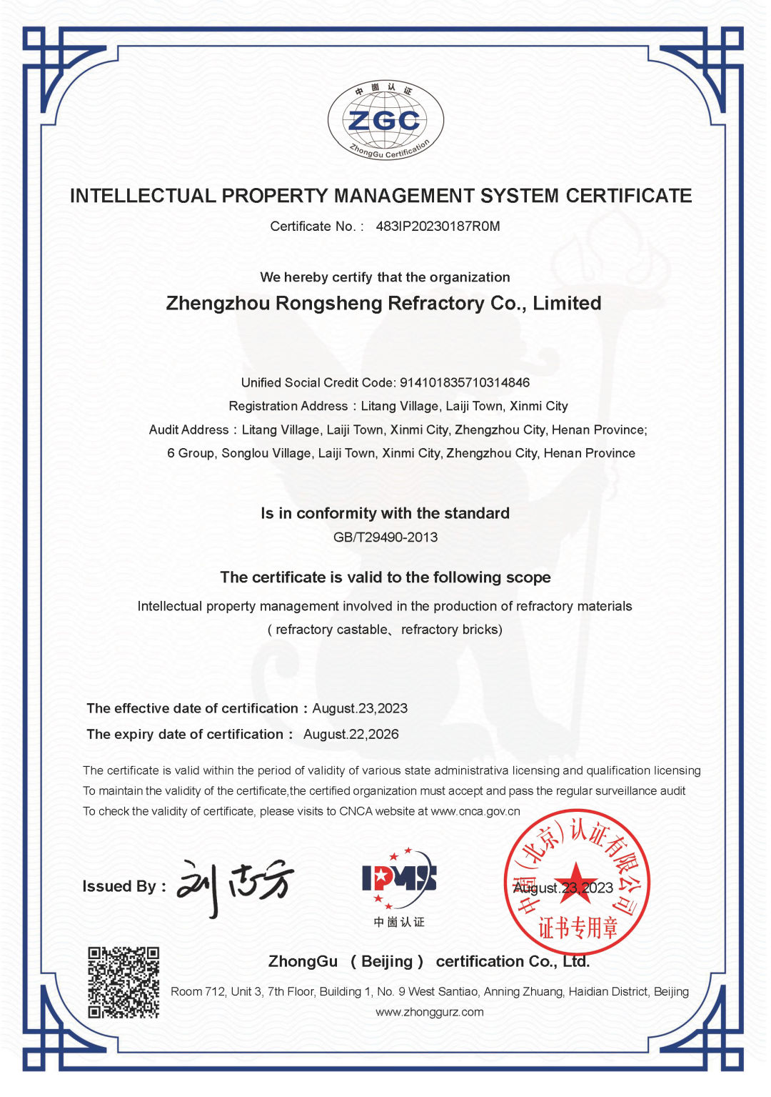 喜訊!榮盛耐材通過國家「知識產(chǎn)權(quán)管理體系認證」!